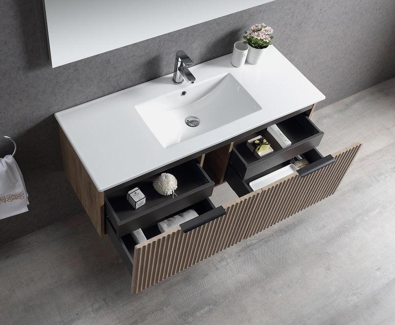 ✔ Fluted Texture Finish - Add a sophisticated, texture look. The vertical grooves of the fluted pattern also add depth and visual interest, making the vanity a statement piece.