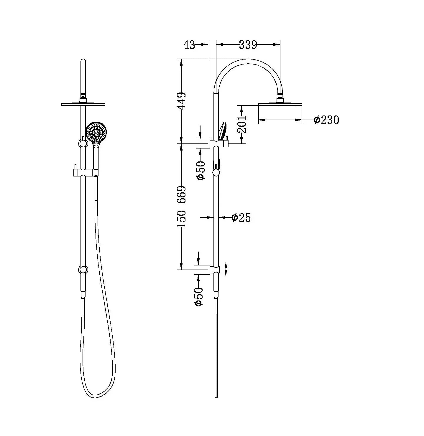 | Purchase Includes | Shower Rail, shower head and hand shower, hose |