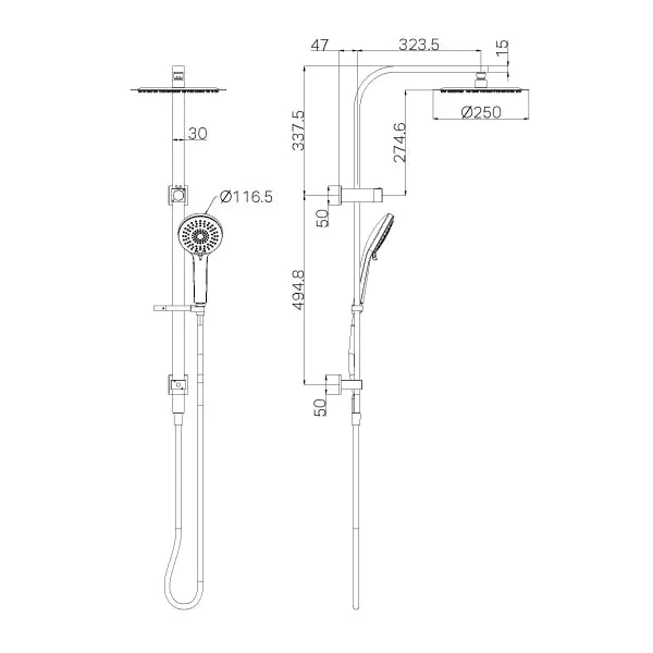 | Purchase Includes | Shower Rail, shower head and hand shower, hose |