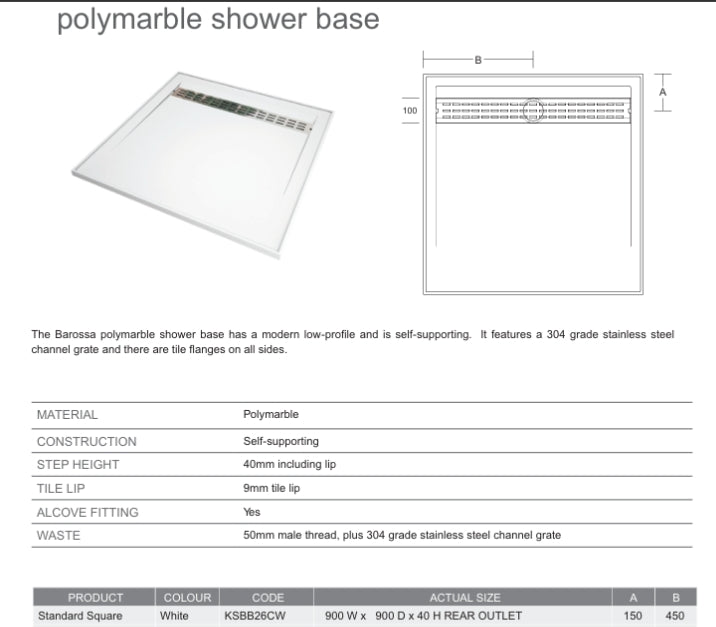 900x900mm Marbletrend Barossa Polymarble Shower Base - Floor Display Clearance