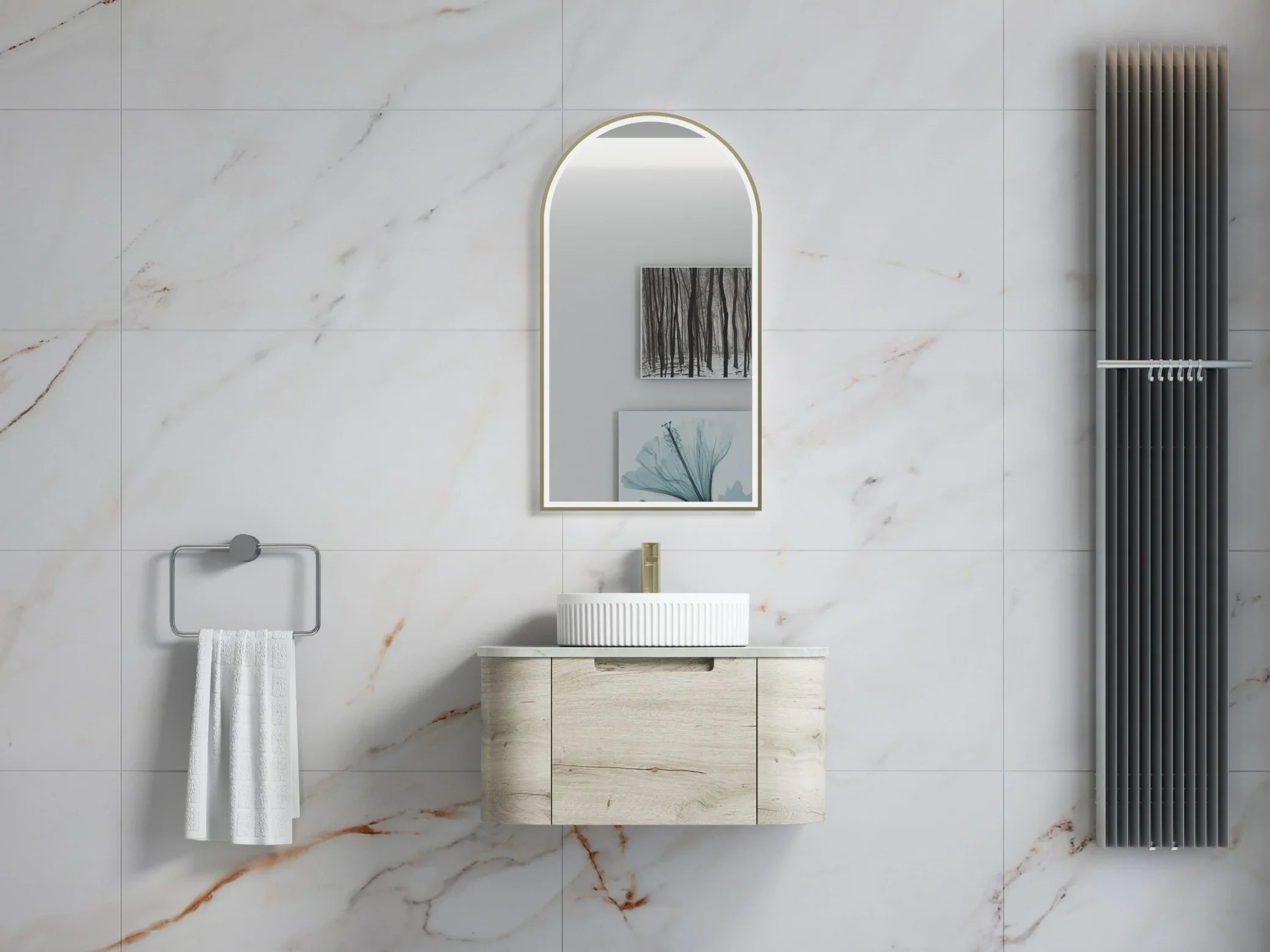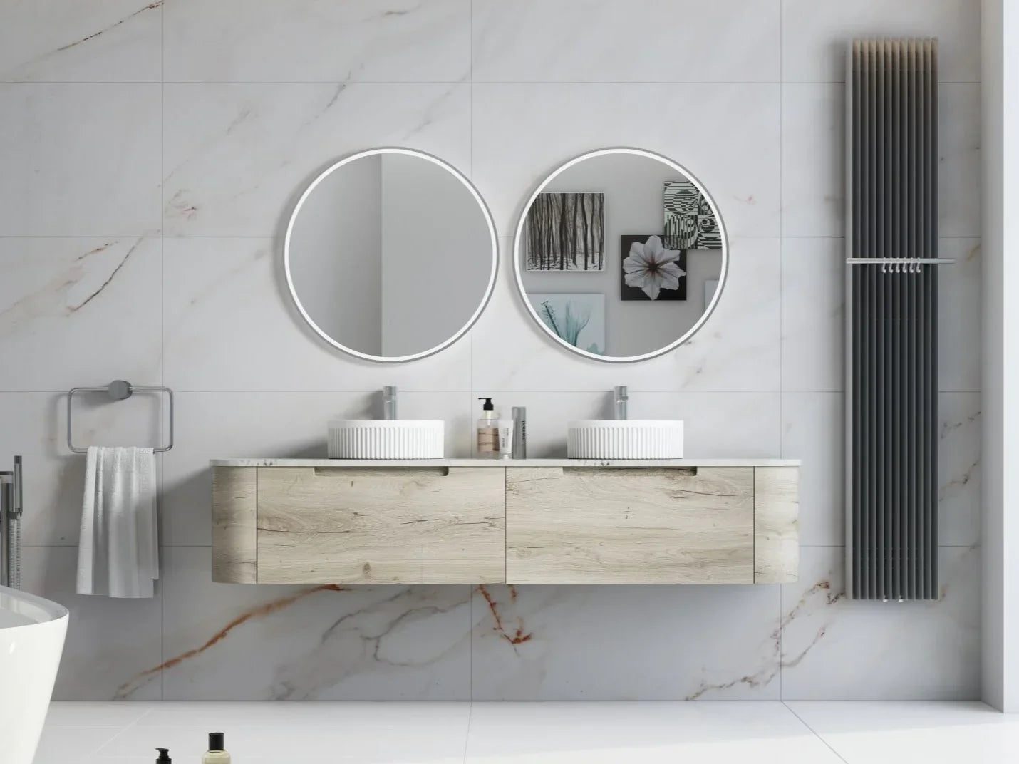 Five calibrated widths available: 750mm, 900mm, 1200mm, 1500mm, 1800mm. This natural wood vanity adapts to various bathroom layouts. Compact powder rooms to spacious master bathrooms covered.