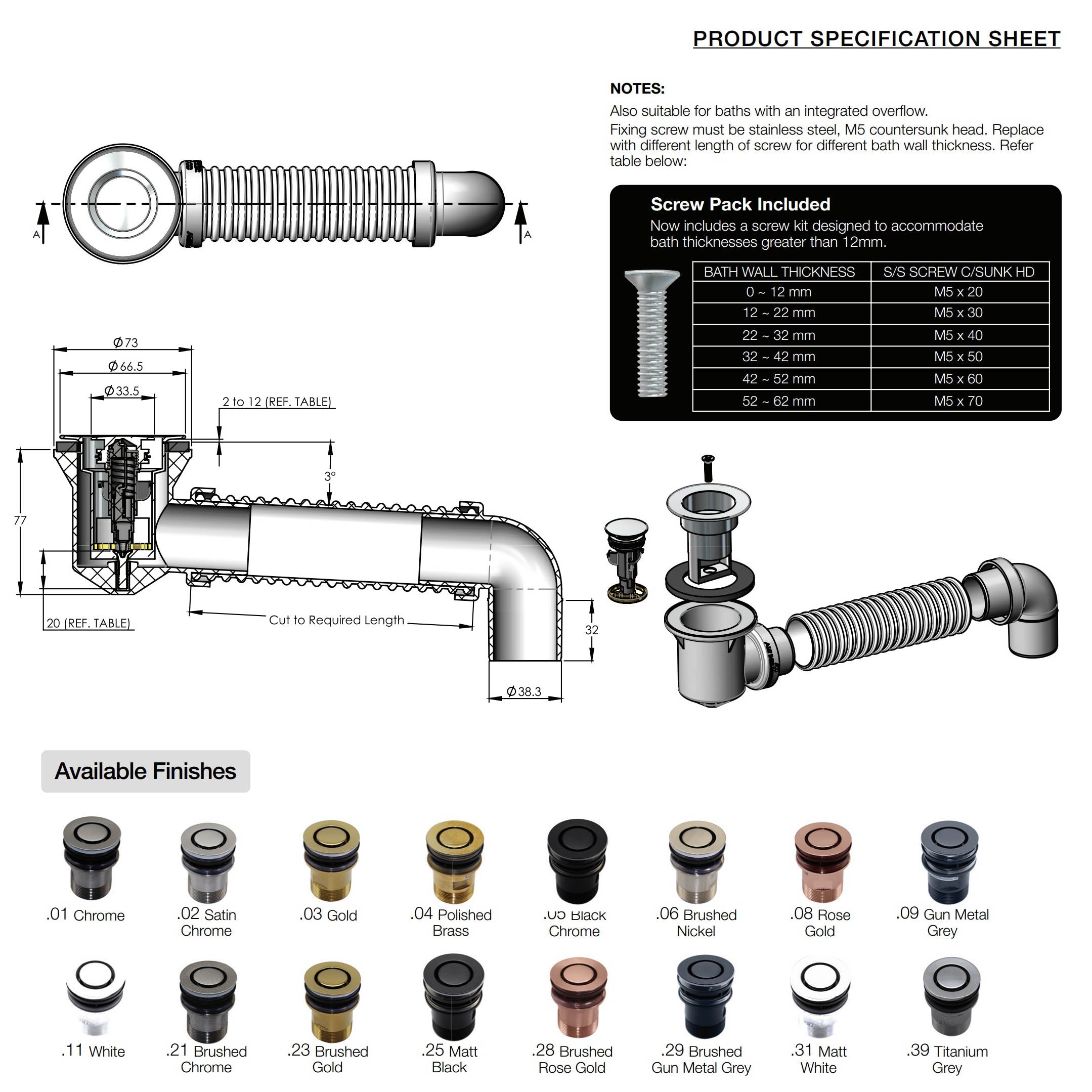 • Adjustable depth for bath thickness up to 12mm
