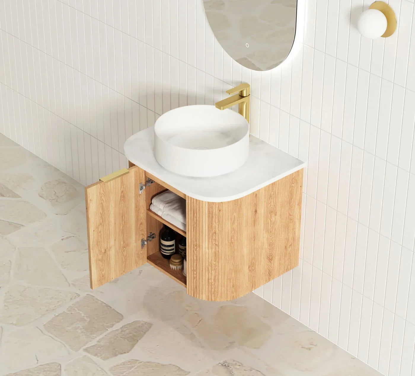 The sleek fluted front and rich Natural Oak finish add a refined, designer touch, while the space-saving bottle trap and taller cabinet height maximise your storage potential. A soft-closing Hettich drawer runner ensures smooth operation, and the internal adjustable shelf offers added flexibility (tradesperson cutout required for plumbing).