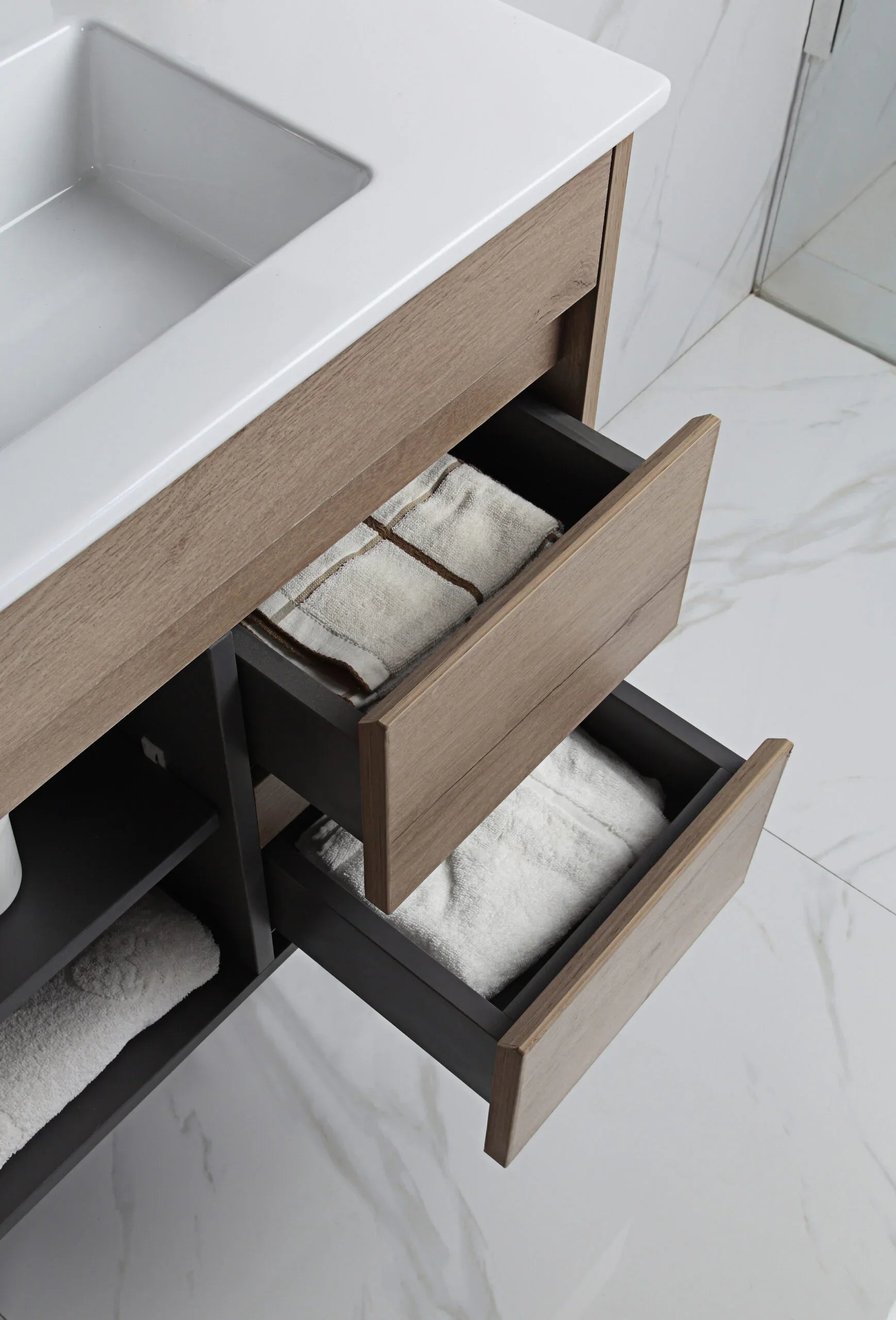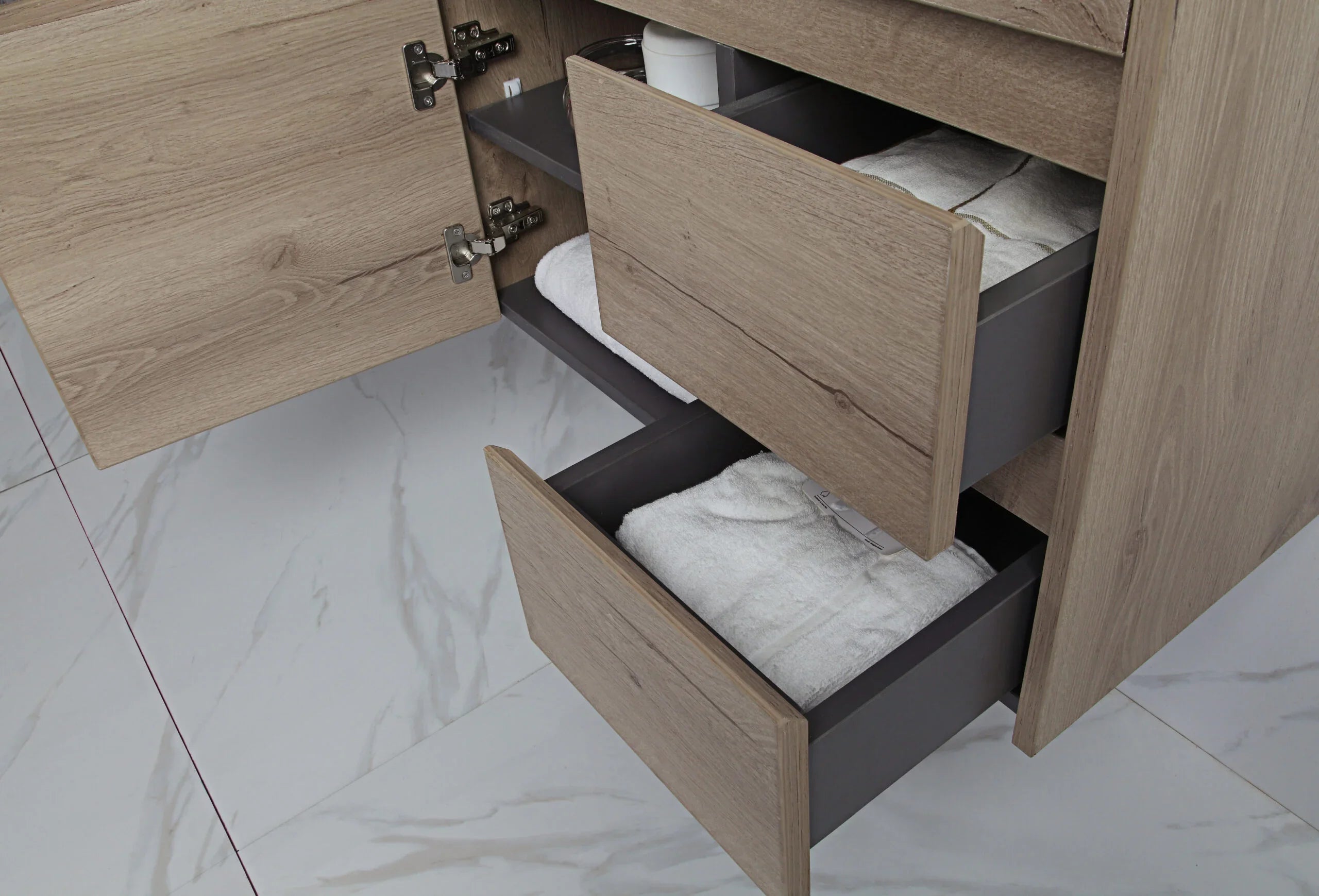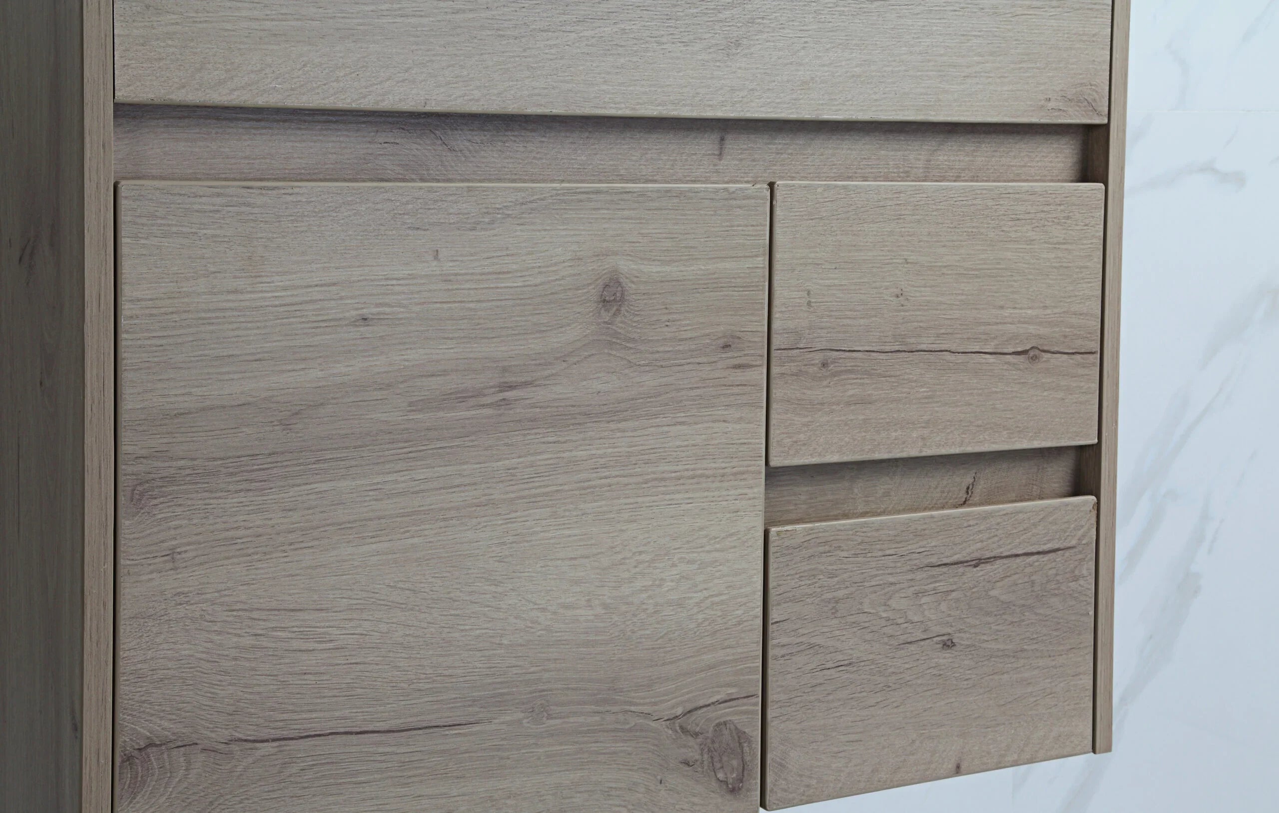 Crafted with a high-quality timber finish, the York vanity showcases refined detailing and a sleek, modern look. It features a combination of soft-close drawers and a door, complete with bevelled edge finger pulls for a seamless, handle-free appearance. An internal shelf adds extra organization, making it easy to keep your bathroom essentials tidy and accessible.