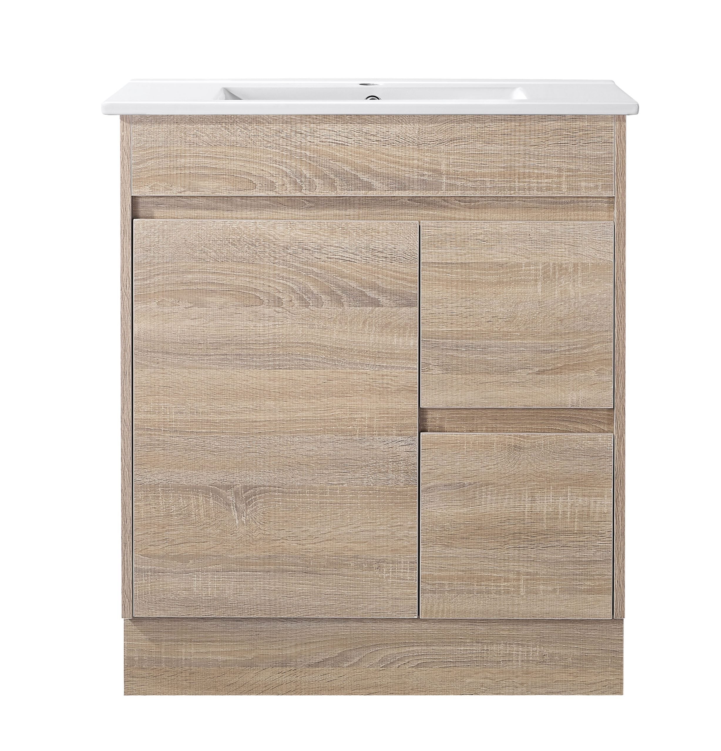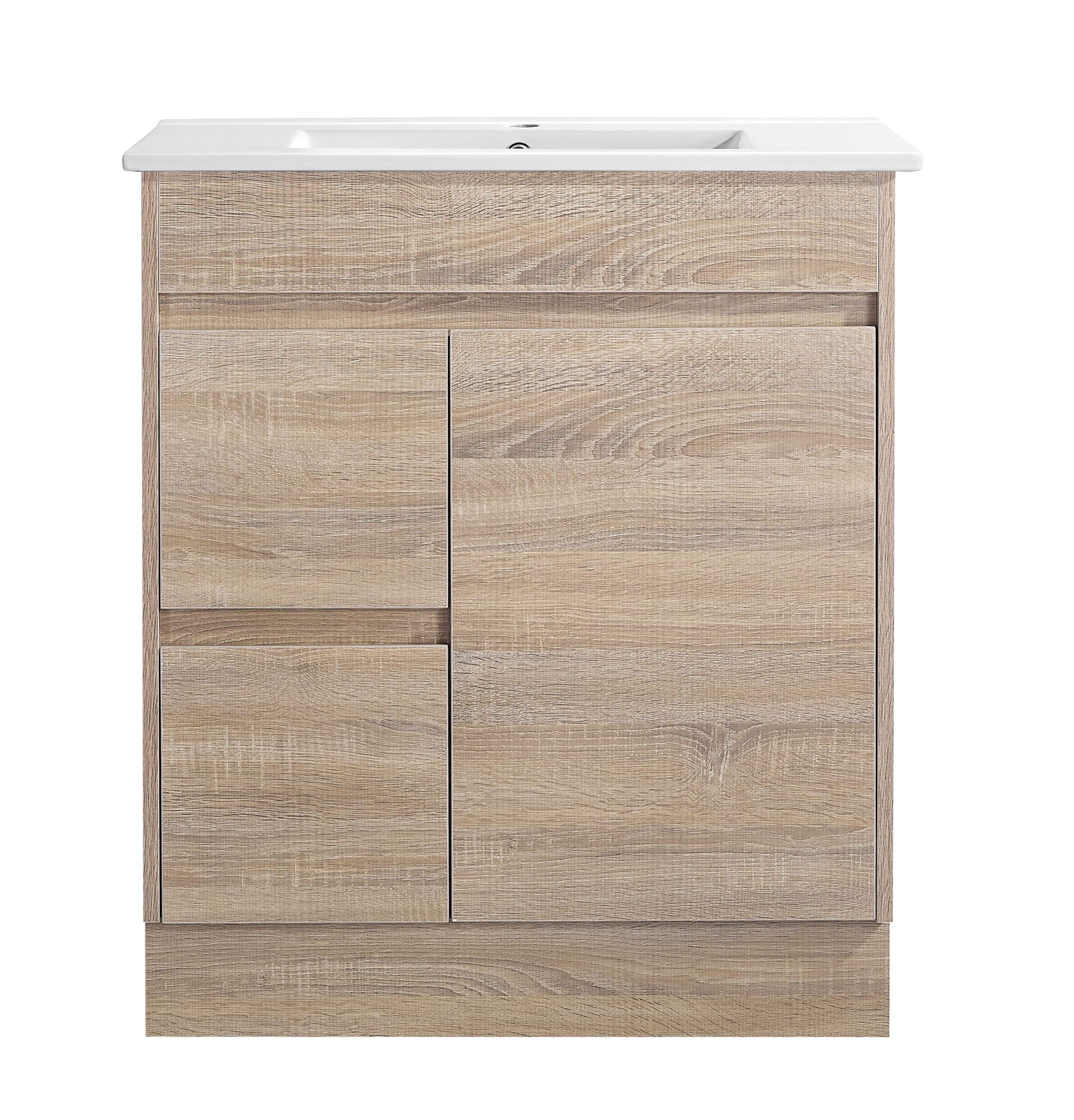 Crafted with a Laminated Woodgrain finish, the BV77 vanity showcases refined detailing and a sleek, modern look. It features a combination of soft-close drawers and a door, complete with bevelled edge finger pulls for a seamless, handle-free appearance. An internal shelf adds extra organization, making it easy to keep your bathroom essentials tidy and accessible.