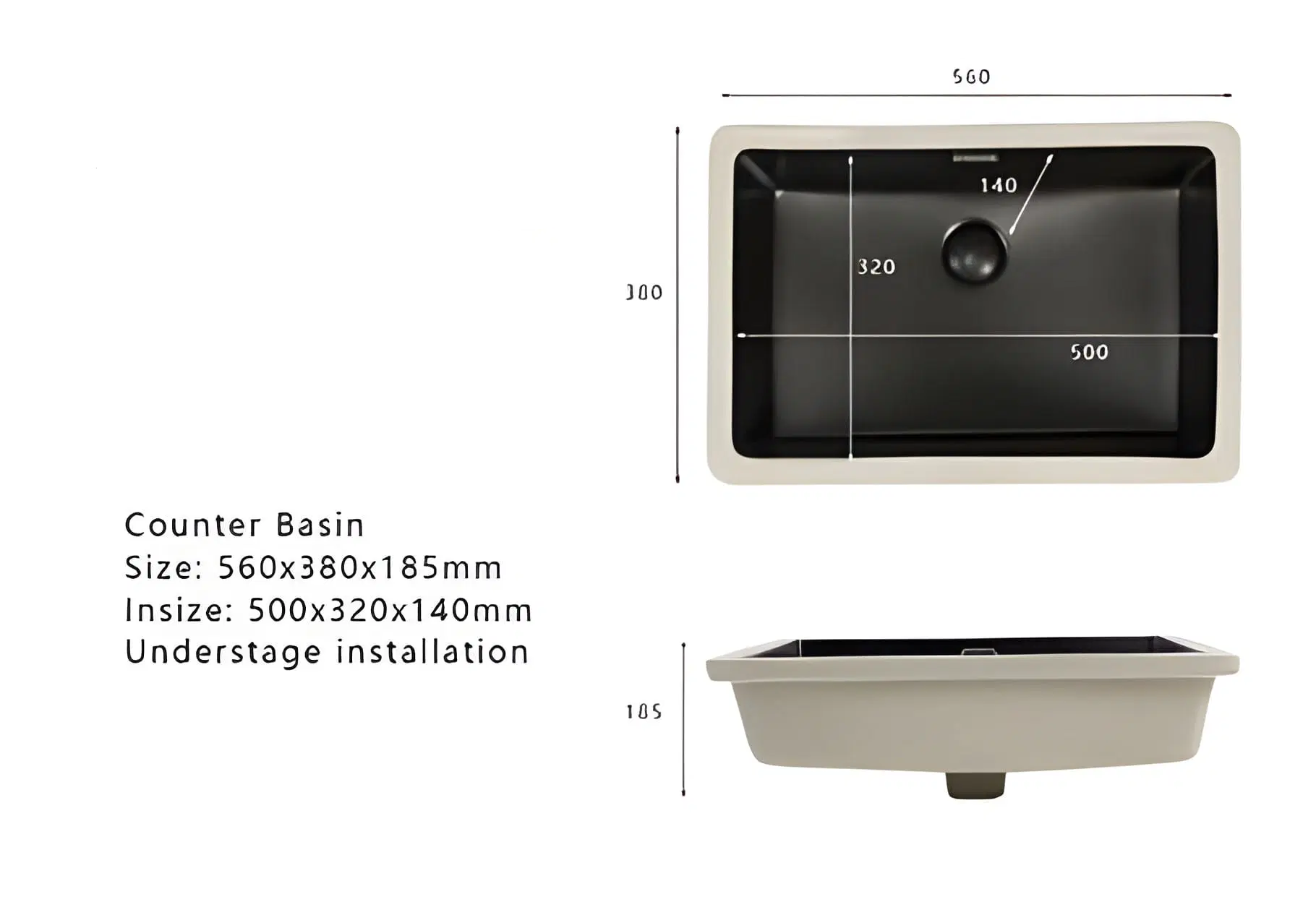 Chica Rectangular Undermount Ceramic Basin 560 x 380mm - Matte Black