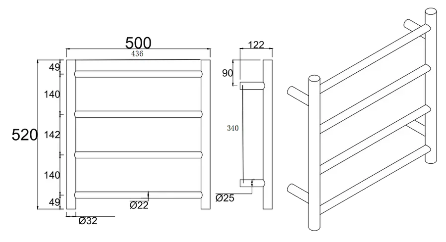 Round Heated Towel Ladder (4 Bars) 500 x 550mm - Various Colours
