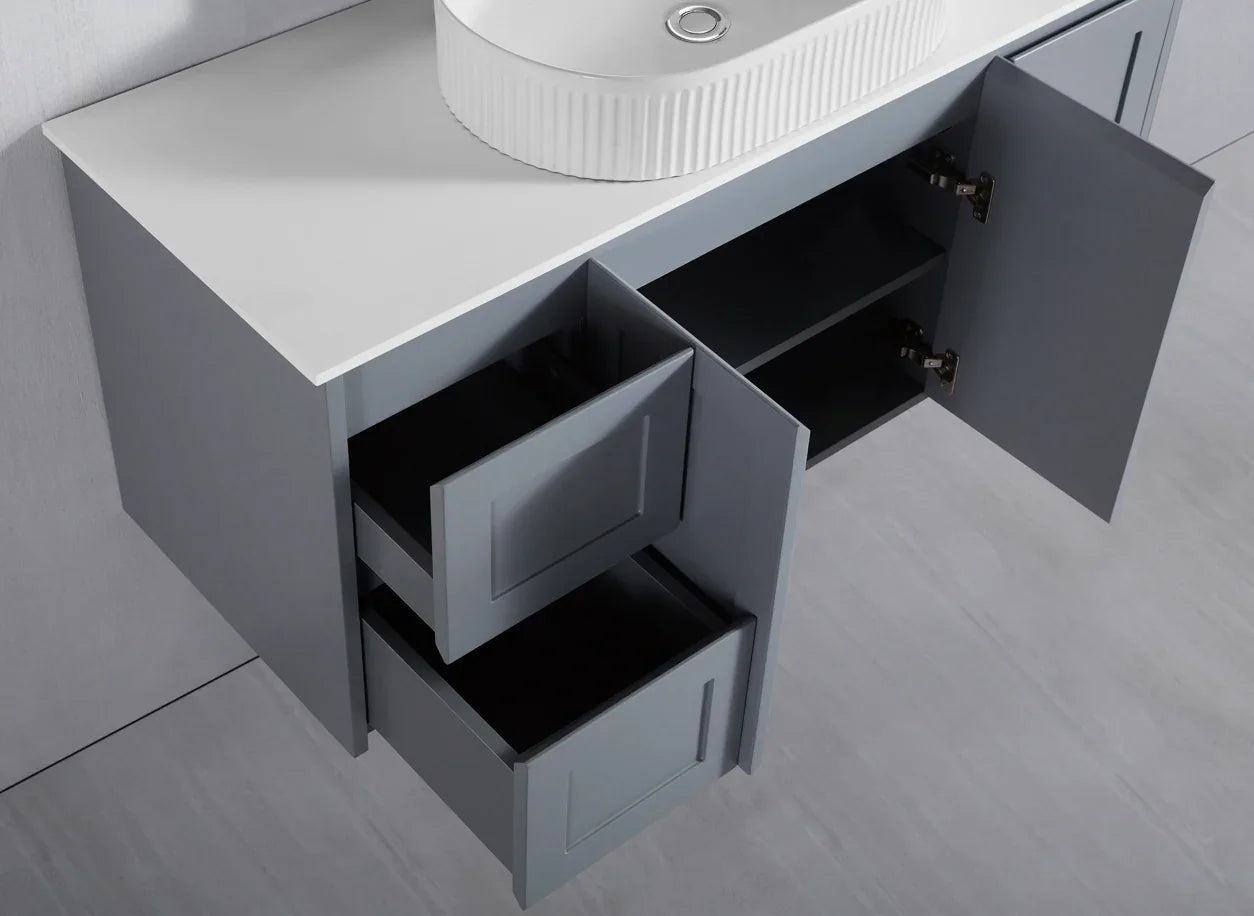 Choose between a seamless ceramic molded top for a fuss-free, integrated look or various stone benchtop options to match your unique style. With soft-close storage, a finger pull opening, and multiple size options, this vanity combines effortless elegance with everyday convenience.