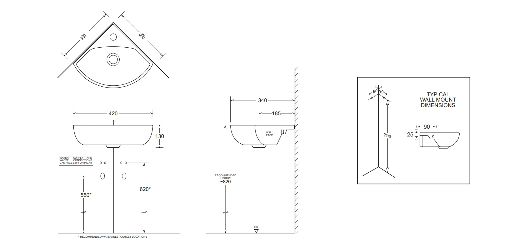 Quado Corner Gloss White Wall Hung Ceramic Basin 300x300mm