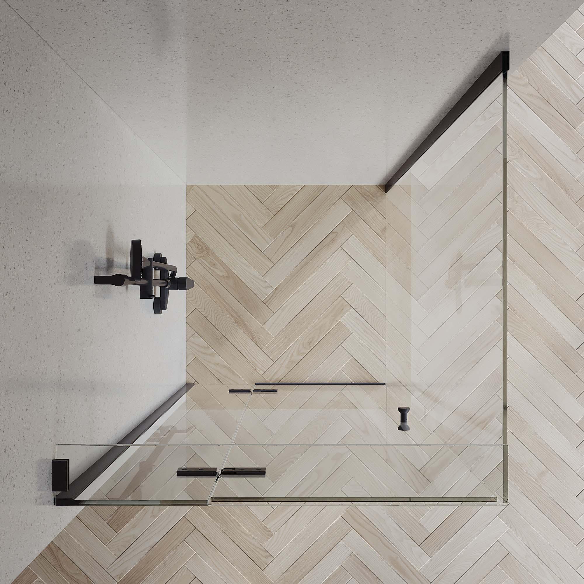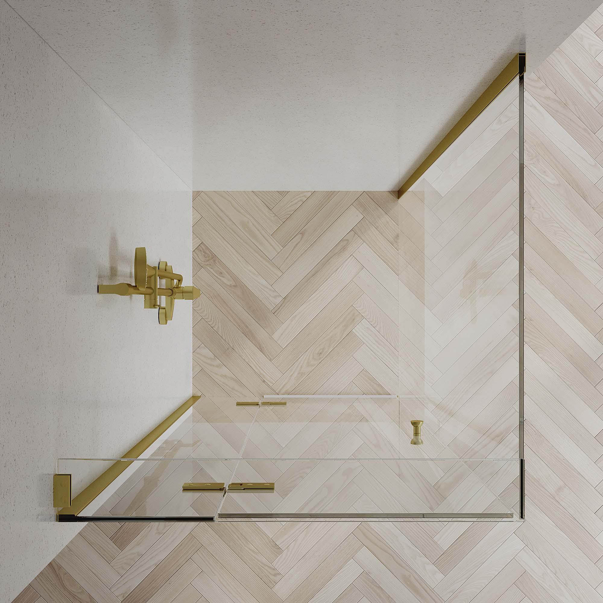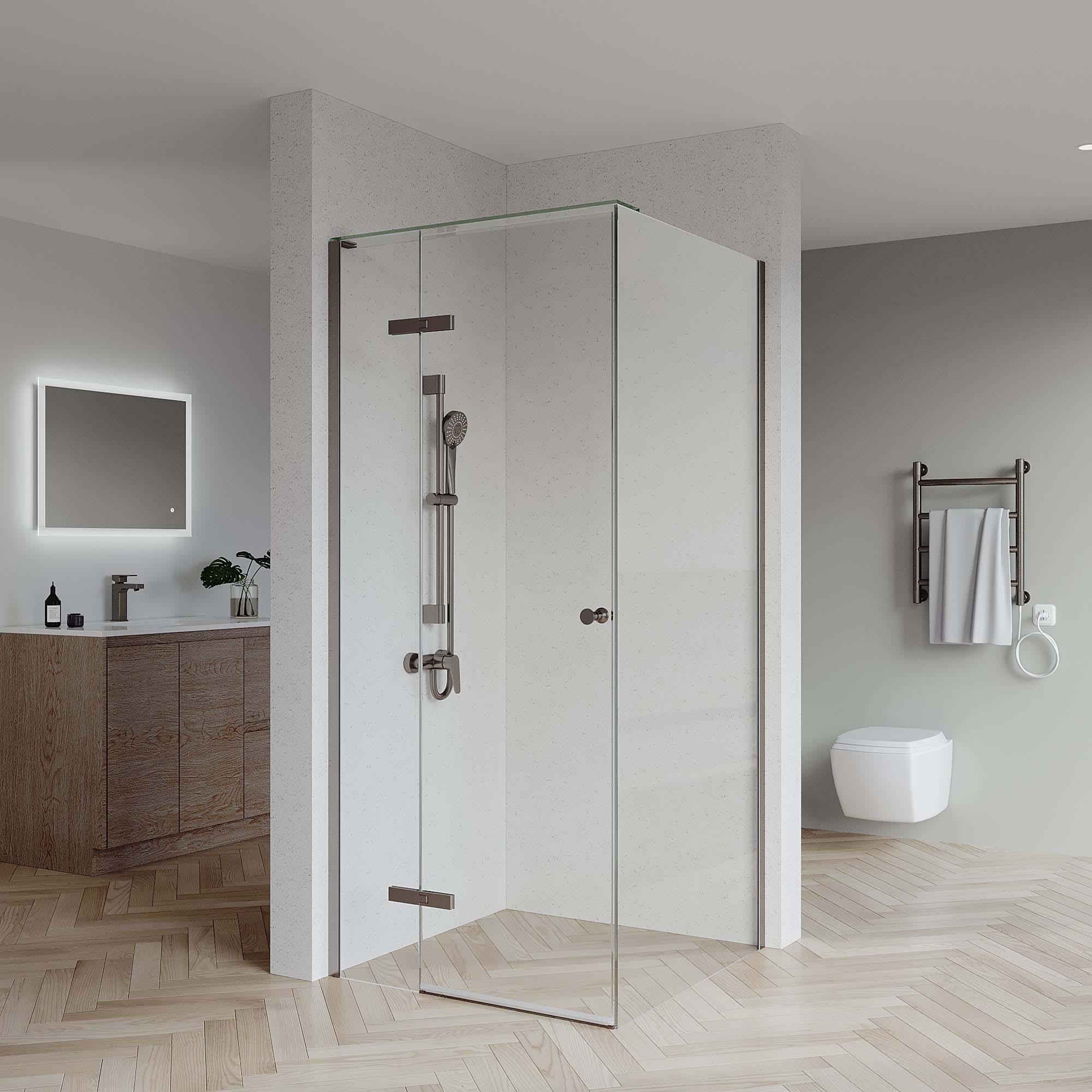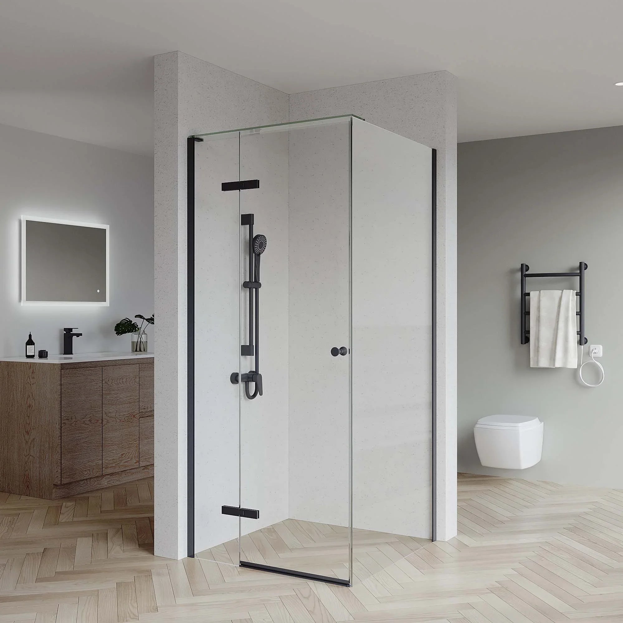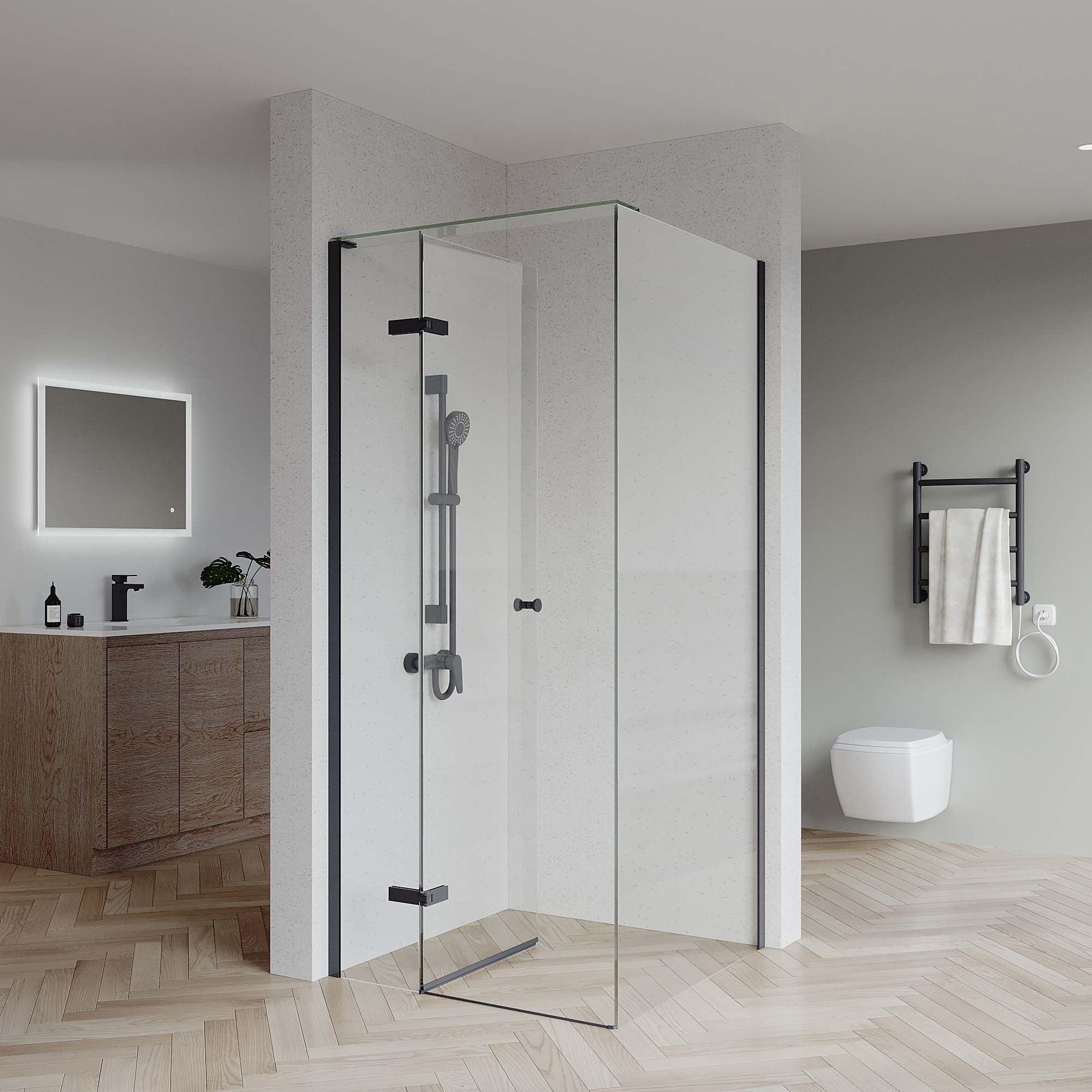 Mix-and-match corner configuration with premium hardware finishes and durable 10mm safety glass