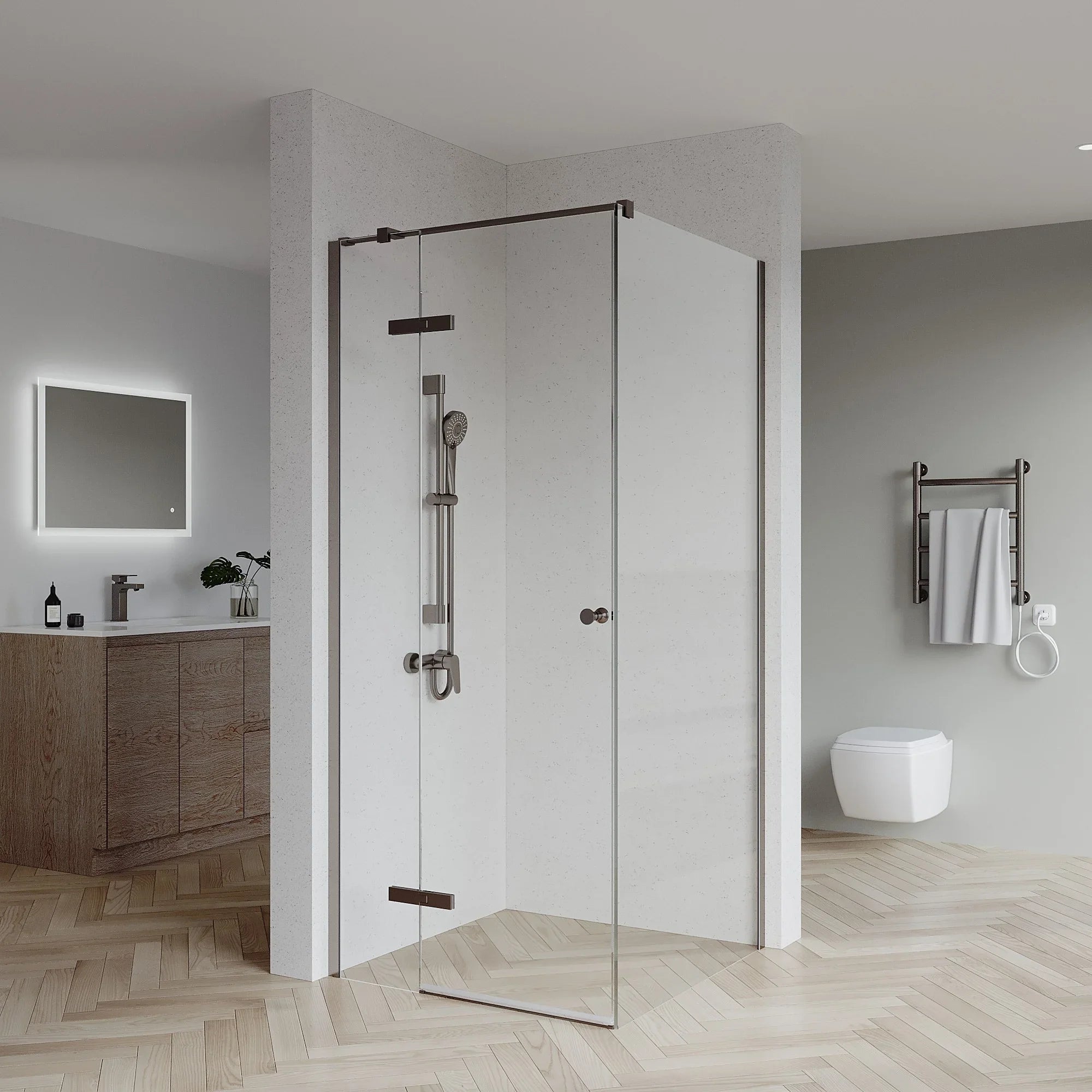 The SS0817 Corner Shower Screen features a semi-frameless pivot door and return panel with a metal top support bar for added stability. Designed to suit standard polymarble bases or tiled floors, this set is ideal for bathrooms needing flexibility in sizing and configuration. Available in 5 hardware finishes and a variety of front/return size combinations.